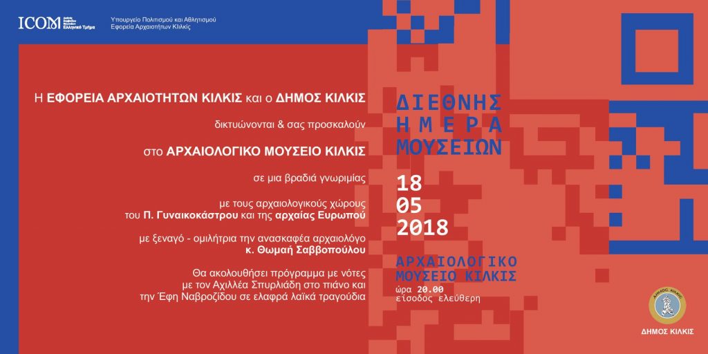 Τη ΔΙΕΘΝΗ ΗΜΕΡΑ ΜΟΥΣΕΙΩΝ 2018, Παρασκευή 18 Μαίου 2018, ώρα 20.00, η ΕΦΟΡΕΙΑ ΑΡΧΑΙΟΤΗΤΩΝ ΚΙΛΚΙΣ